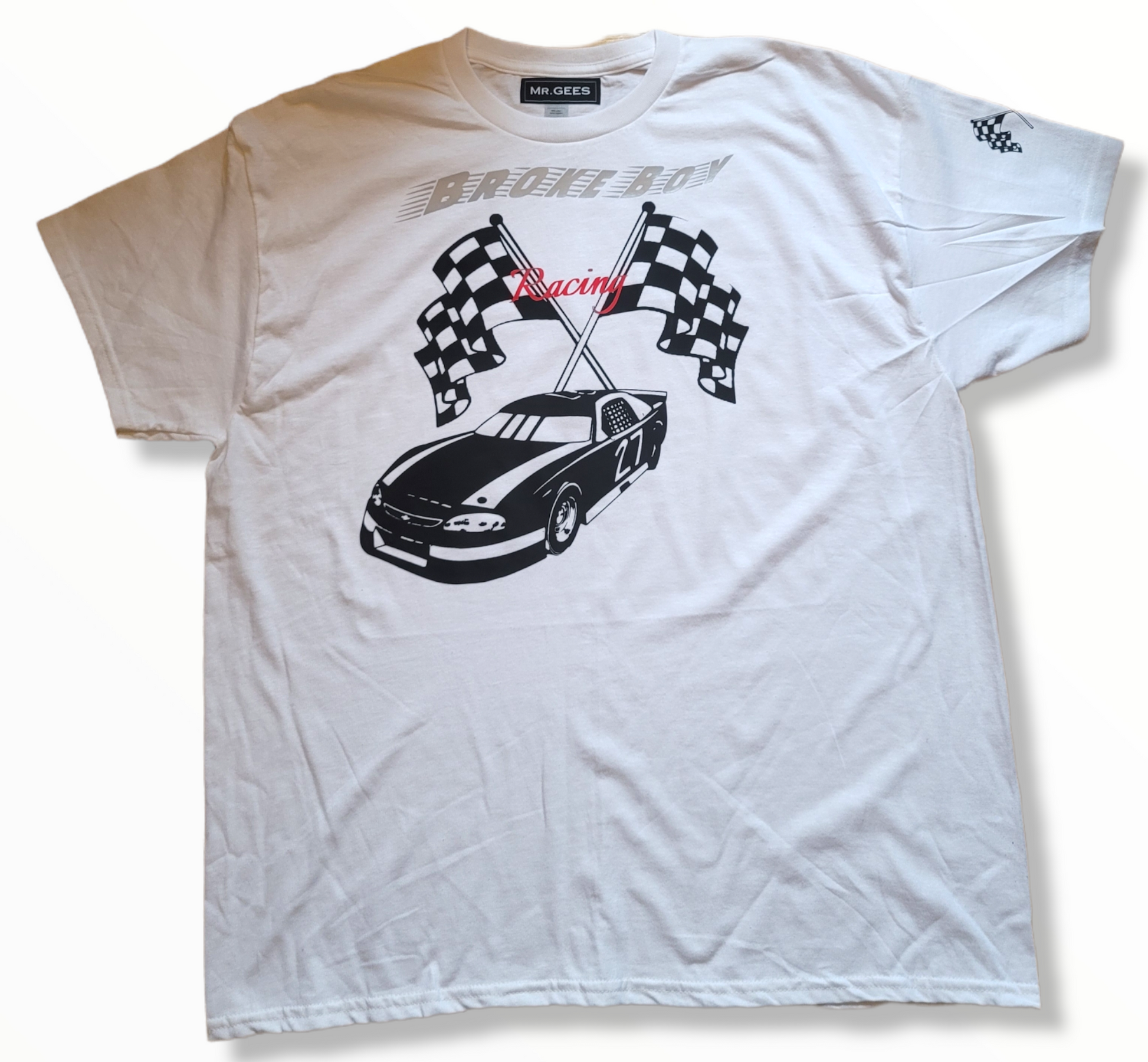 White color t shirt/ black logo/ gray & Red letters